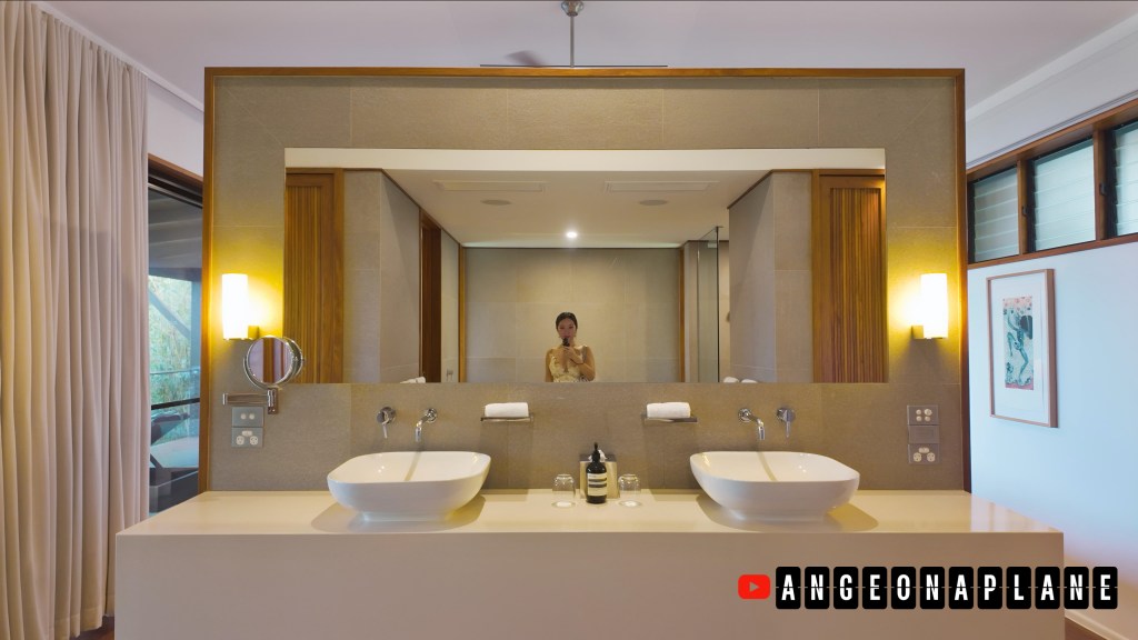 We stayed in a Leeward Pavilion, the most affordable option at about $1,700 AUD per night. Pavilion 28 featured a spacious living area, beautiful Coral Sea views, and a well-stocked minibar with unlimited non-alcoholic drinks. There was bug spray on hand (thankfully unnecessary) and a fridge that wasn’t for ice but stocked with glassware and essentials like an ironing board and adapters.
