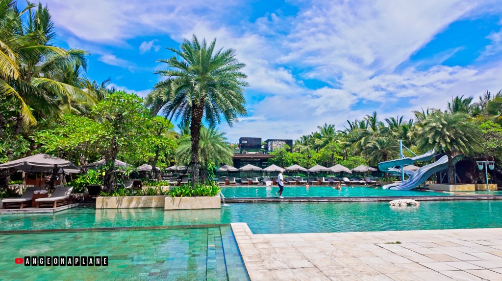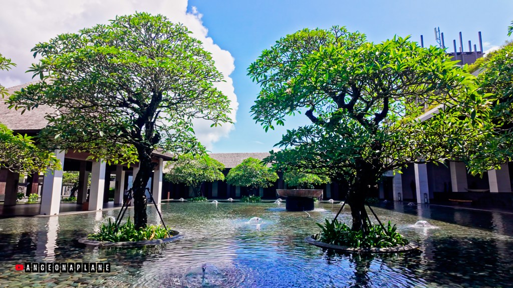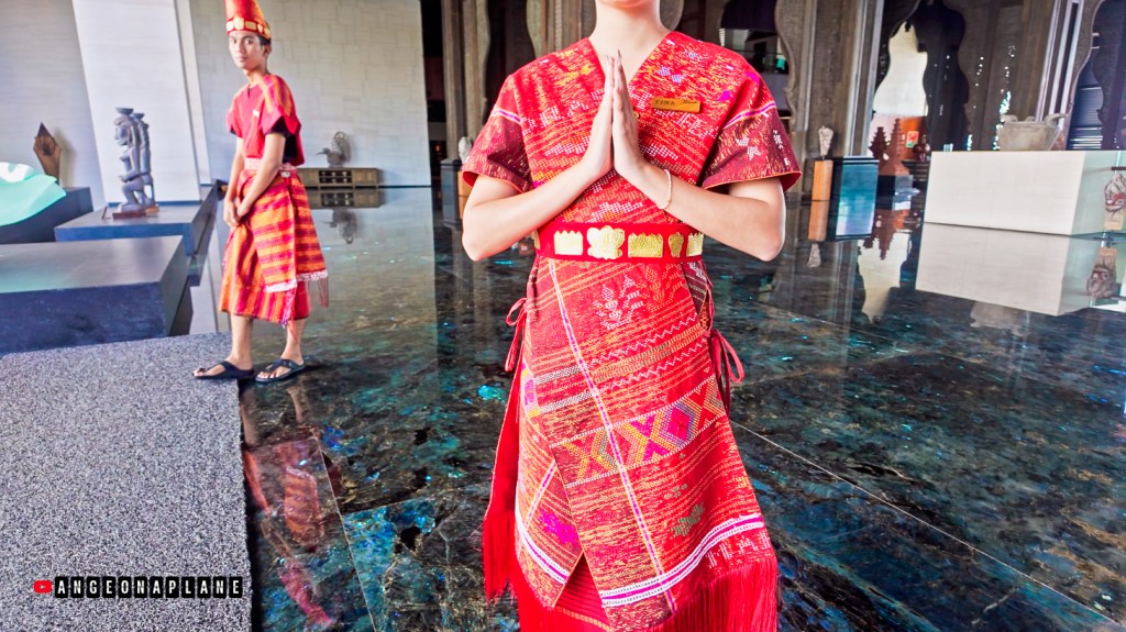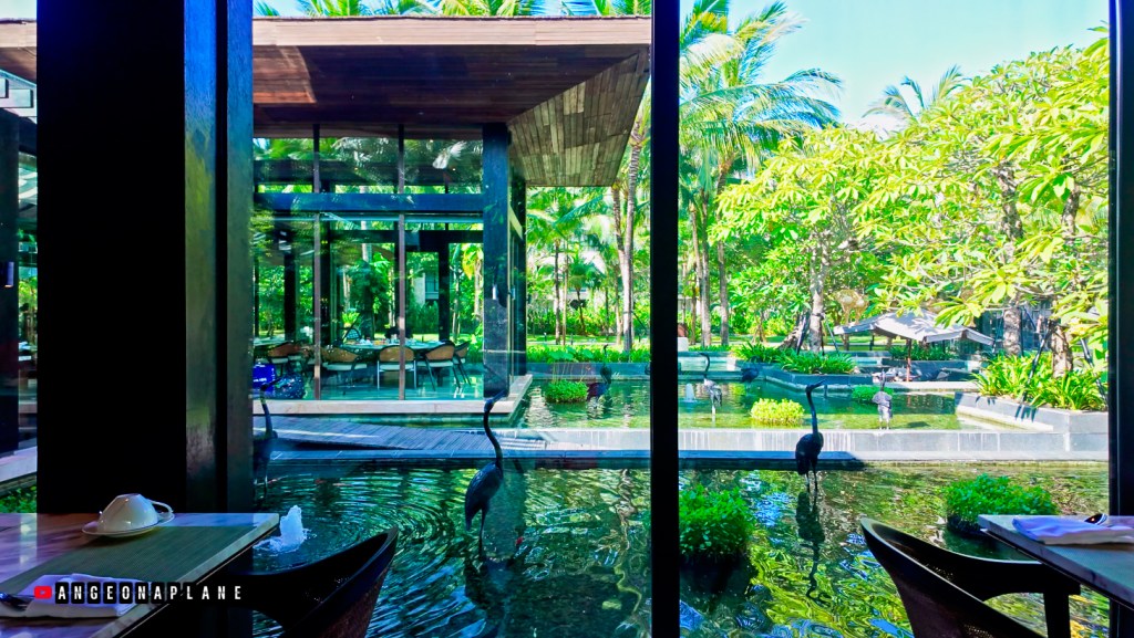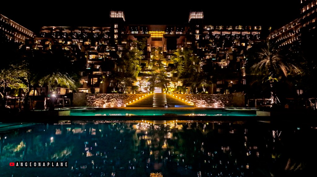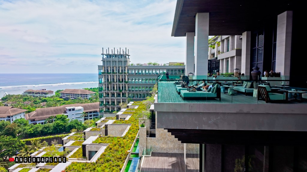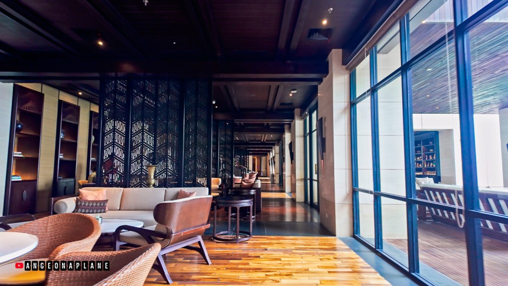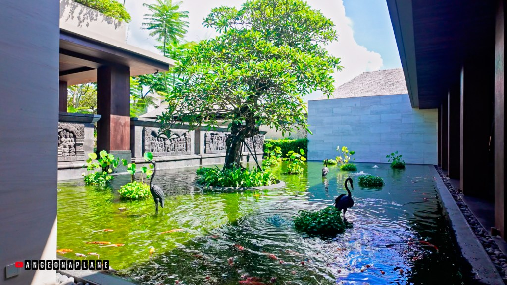 This might just be the grandest lobby I’ve seen – with soaring ceilings, a dramatic gold artwork featuring Balinese wings, and an open layout perched high above the resort. From the bar at the back of the lobby (we were up on Level 10), you can actually look down across the hotel, the pools, and even spot the glass tunnel where Koral Restaurant sits with it’s underwater dining.
