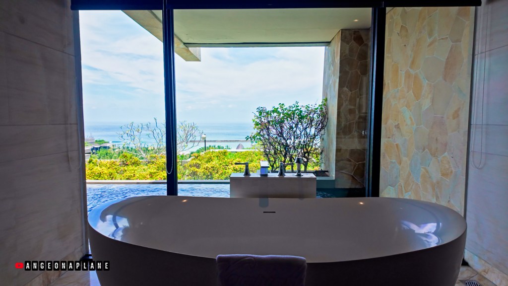 - Vibe: Modern Balinese textures, polished stone, lots of warm wood, and ocean views that peek through from multiple angles (even a cheeky glimpse from the bathroom).